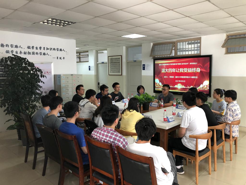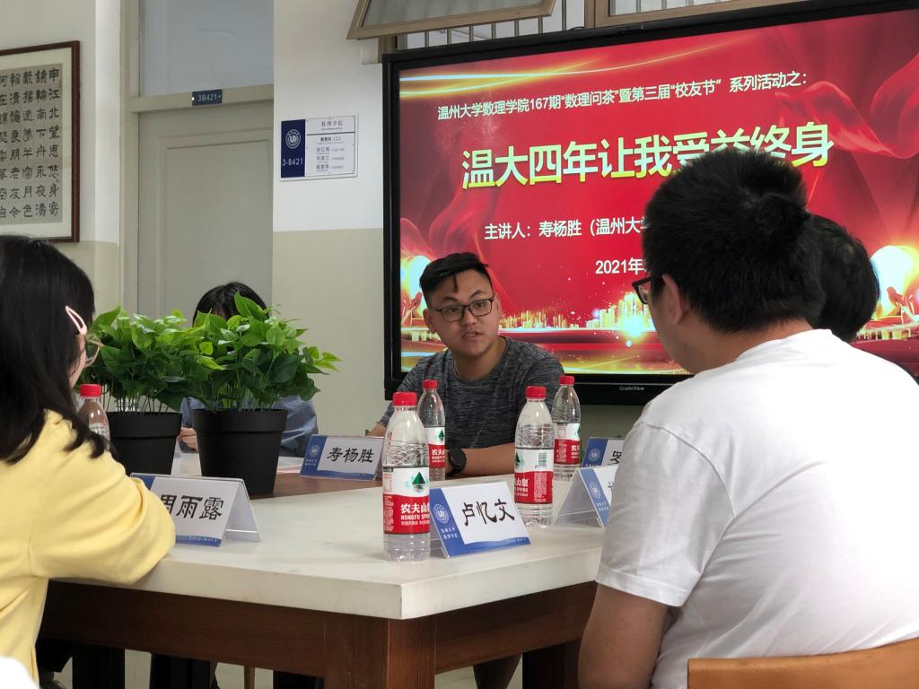 借此机会,永利集团304am官方入口邀请寿杨胜等六名校友举办第167期数理问茶活动《温大四年让我受益终身》,为学弟学妹分享他们的大学学习和职场生活感悟。本次活动也是学校第三届“校友节”系列活动之一。