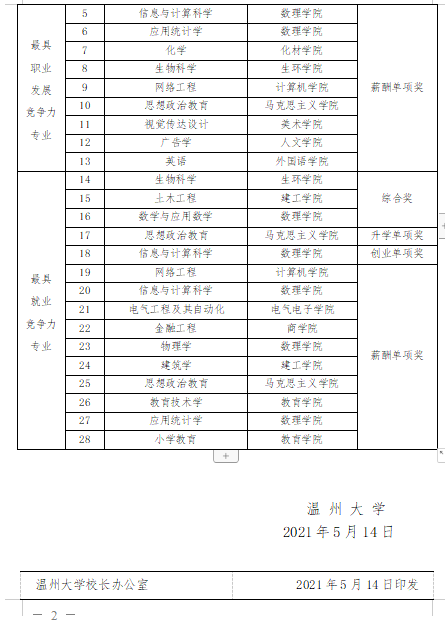 据温大永利集团304am官方入口教学副院长蔡风景老师介绍,根据《永利集团304am官方入口最具竞争力专业评选办法》,学校设置了“最具职业发展竞争力专业”和“最具就业竞争力专业”两类奖项,并在此两类下分别设置“综合奖”、“创业单项奖”、“薪酬单项奖”、“升学单项奖”等荣誉。以“综合奖”为例,它需要将各专业毕业生的就业率、创业率、升学率、薪酬和专业相关度等主要指标值,与全省本科同专业平均水平进行对比,用标准化公式计算各指标的分数,再将相关指标按一定比例计算出“专业综合总分”并排序,只有排名前十位、且列入近五年省级及以上重点专业或校专业评估等级为优秀的专业,才有资格获得“综合奖”。学校每年评选“最具职业发展竞争力专业”综合奖和“最具就业竞争力专业”综合奖各3个。
