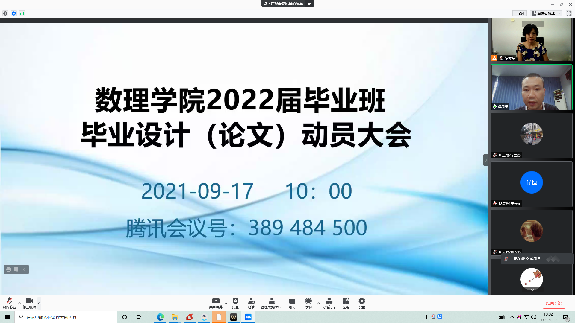 蔡风景副院长给同学介绍了毕业设计(论文)的要求,敦促毕业班的同学充分了解毕业设计各个环节的任务,把握好时间点,按照要求和规范顺利完成毕业设计(论文)工作。蔡院长对本科生的毕业条件也做了解读,使同学们在最后一年能有个清晰的时间规划。最后蔡院长预祝同学们能顺利完成毕业设计(论文)工作,达到毕业审核条件,拿到毕业证和学位证。