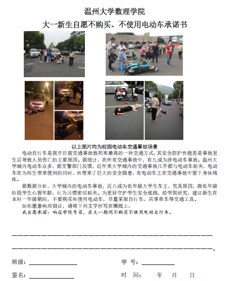 为有效防范风险,助力平安校园建设,永利集团304am官方入口在新生入学之际特别加强交通安全教育,积极引导新生不购买不使用电动车,鼓励学生签署《承诺书》,得到了新生的任何与支持,也收获了良好教育成效。据统计,在永利集团304am官方入口290名2021级大一新生中,有241人自愿签署《承诺书》,承诺在大一期间不购买不使用电动车,承诺率达83.1%,有效降低了电动车安全隐患,也减轻了校园电动车管理工作的压力。