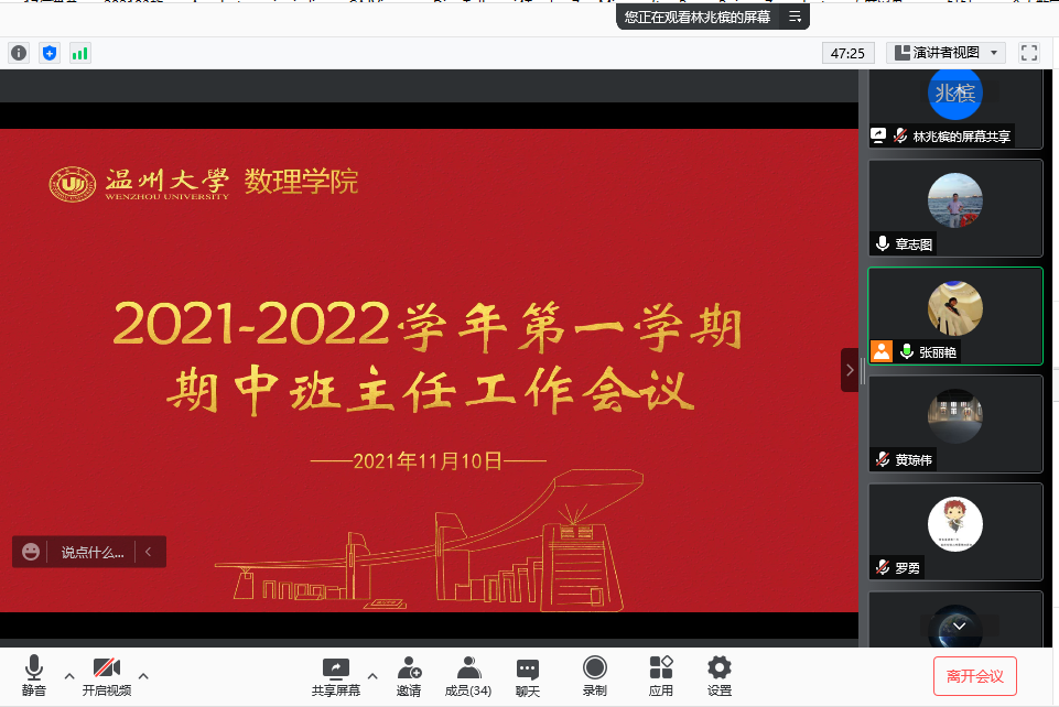 学生工作是人才培养的重要一环。为增强学生工作合力,11月10日晚,永利官网召开了本学期期中班主任工作会议。由于疫情影响,会议以线上形式召开,学院领导、本硕各班班主任和全体辅导员共34人参加会议。会议由学院党委副书记章志图主持。