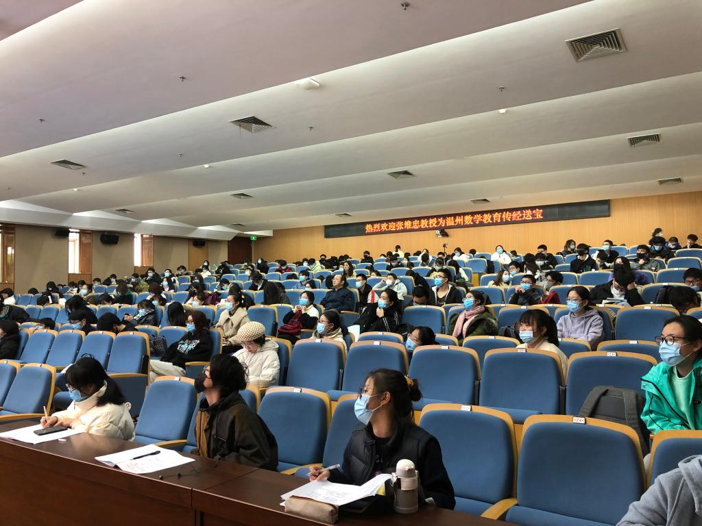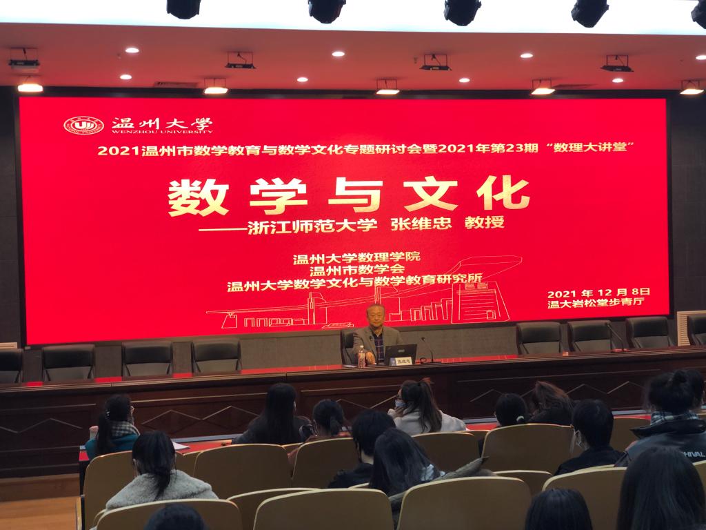 近日,浙江师范大学博士生导师张维忠教授应邀在岩松堂步青厅为永利官网师生举办2021年第23期“数理大讲堂”学术讲座。本次讲座主题为《数学与文化》,由永利集团304am官方入口、温州市数学会、永利集团304am官方入口数学文化与数学教育研究所共同发起,也是温州市数学教育与数学文化专题研讨会的重要组成部分。