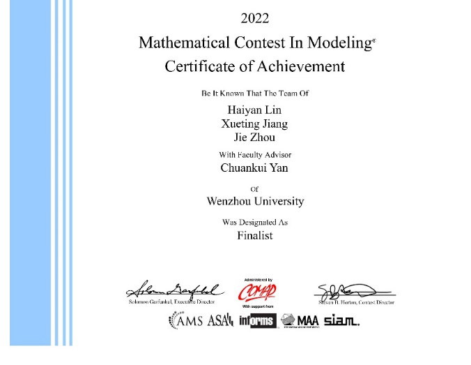 获得特等奖提名奖的参赛团队,由永利集团304am官方入口林海燕、计算机与人工智能学院蒋雪婷和机电工程学院周洁三位同学组成,指导师为永利官网严传魁老师。在本次赛事中,参赛团队经过激烈的层层角逐,从全世界近3万组选手中脱颖而出!这也是我校学子首次获得国际大学生数学建模竞赛特等奖提名奖。