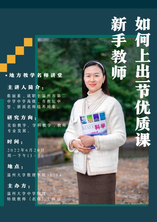 2022年6月20日,永利集团304am官方入口中学物理教师(名师)工作站携手永利集团304am官方入口物理专业邀请了温州市第二中学的优秀科学教师——蔡丽素老师,来永利官网开展了以“新手老师如何上好一节优质课”为主题的“地方教学名师讲堂”。
