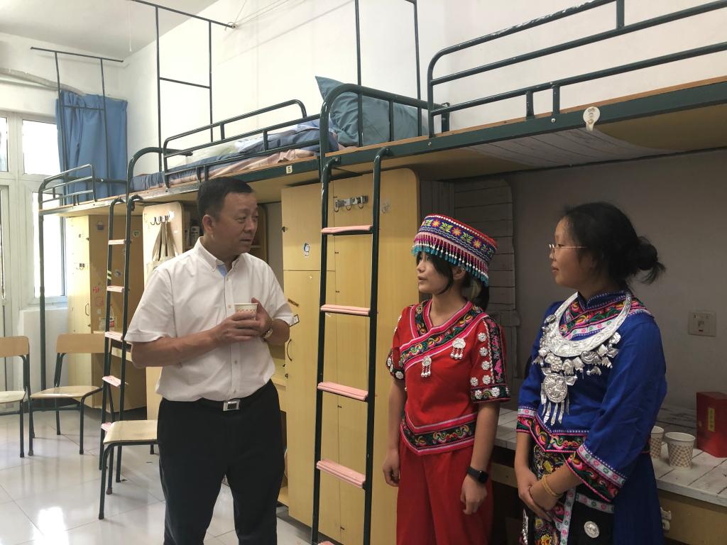 超豪学区E3-505寝室住着永利官网数学与应用数学师范专业6名新生,大家来自湖南、贵州、四川、浙江等地,可谓五湖四海。E3-505还是一个多民族混居寝室,土家族姑娘王书漫、苗族姑娘吴贞鞠和晏子、吴心彤等汉族姑娘共同居住在这个温暖的空间。虽然大家民族成分多样,但由于同样的年轻、相同的专业,她们很快熟络起来。得知谢树华书记要来寝室看望的消息,两位少数民族姑娘还特意穿上了漂亮的民族服装,以贵宾之礼迎接老师,以民族礼节为老师奉上茶水。在温馨有爱的氛围中,谢书记热情欢迎并亲切慰问新同学,寄语大家珍惜大学友谊,处好寝室关系,维护民族团结,大家互帮互助,不论在学习还是生活中都能做到共同进步。