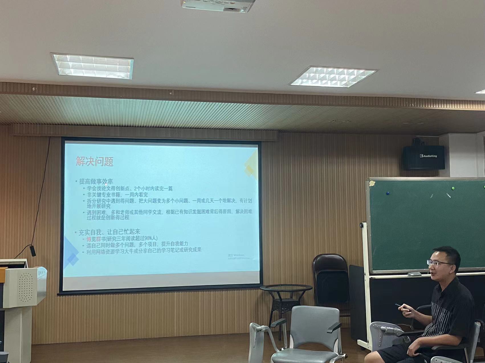 活动中周世荣博士结合自己的读研生活向同学们讲述了如何看好一篇文章、一本书,如何根据自己的需要学习一门编程语言。同时针对同学们的会遇到的问题如看文献效率低、拖拉等问题进行了解答。周世荣博士建议大家看文献要学会找到创新点,研读创新部分;非专业的书籍要快速读完,待用到时再精度;做好科研规划,坚决完成每一期的目标。在互动交流环节,同学们结合个人情况积极提问,周博士一一进行解答。
