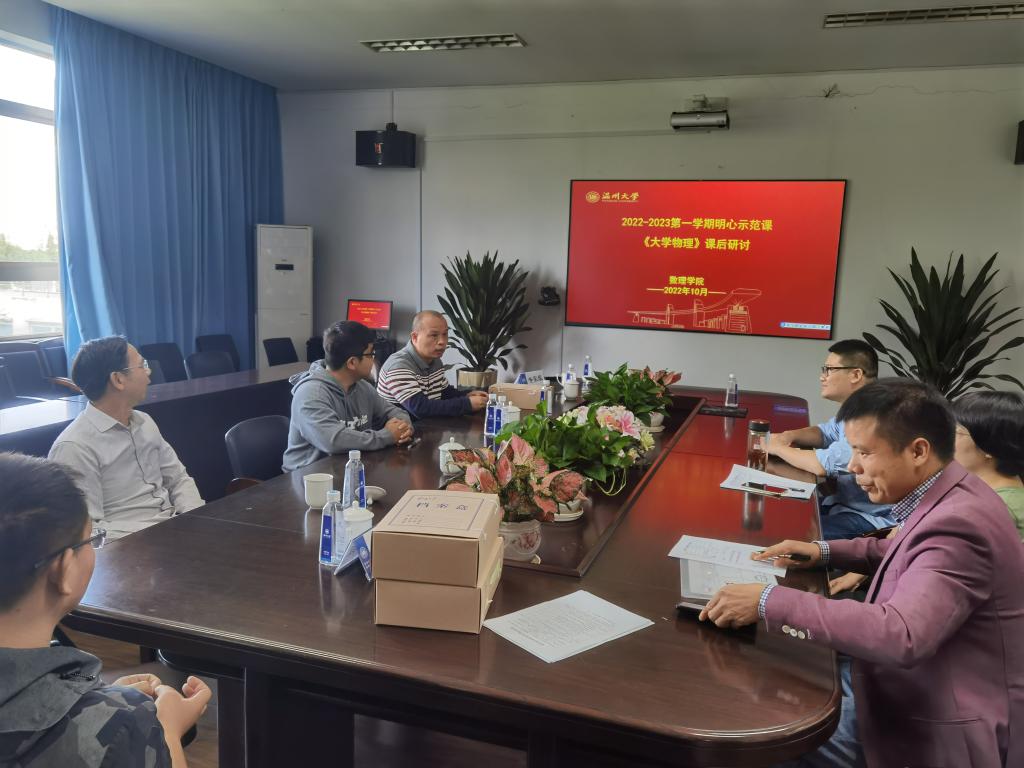 课后研讨会在3B406会议室进行,研讨会认为何林李老师备课充分,讲解清晰,师生互动良好,以前三章的思维导图为切入点,对刚体力学进行了归纳总结,引导学生理论联系实际,学以致用。课程中加入的思政元素,引导学生要发奋图强,科技强国,以及民族自豪感,深入贯彻执行了全国高校思想政治工作会议精神。