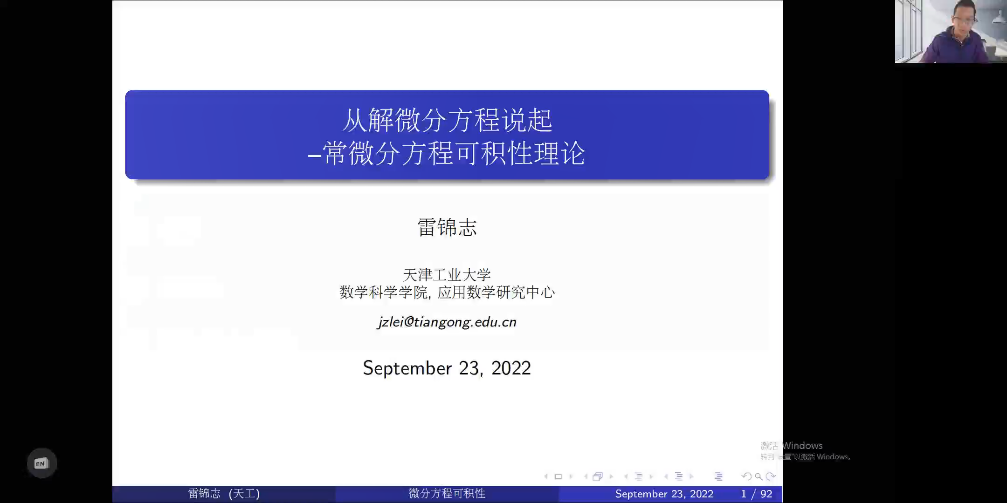2022年10月13日上午,天津工业大学雷锦志教授应邀在线作了题为“从解微分方程说起——常微分方程可积性理论”的学术报告。这场报告会由王子子博士主持,于恒国、胡亦郑与黄琼伟等老师,及数学系、统计系部分研究生以及线上其他学校的师生参加了这场学术报告。