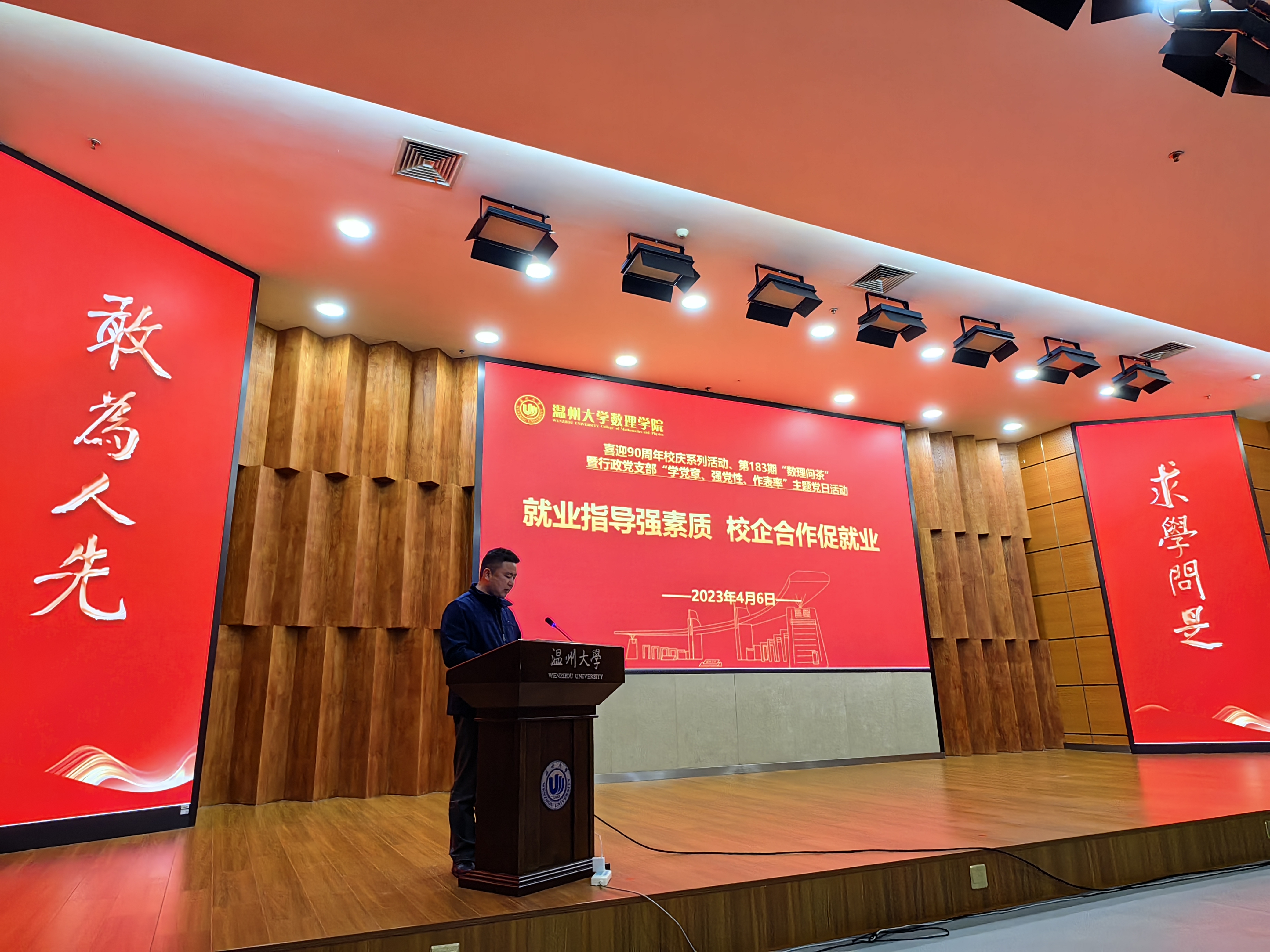 为积极推进毕业生就业工作,以奋进姿态喜迎办学90周年大庆,4月6日下午,永利集团304am官方入口邀请党建联建单位——新华保险温州中支的领导与嘉宾来校为师生举办就业指导讲座。讲座在南校区岩松堂雁山厅举行,由学院党委副书记章志图主持,来自20统计、20信算的全班同学以及教工行政党支部的全体党员参加了学习。本次活动是第183期数理问茶,也是教工行政党支部“学党章、强党性、作表率”主题党日活动的内容之一。