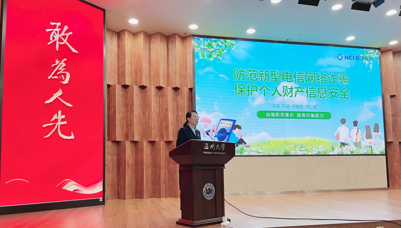 活动伊始,新华保险温州中支总监朱秀薇女士为大家带来了一场精彩的微党课,她用生动的语言、丰富的案例,从廉洁教育、国家安全教育以及防患网络诈骗三个角度进行深入阐述,悉心指导大学生健康成长。