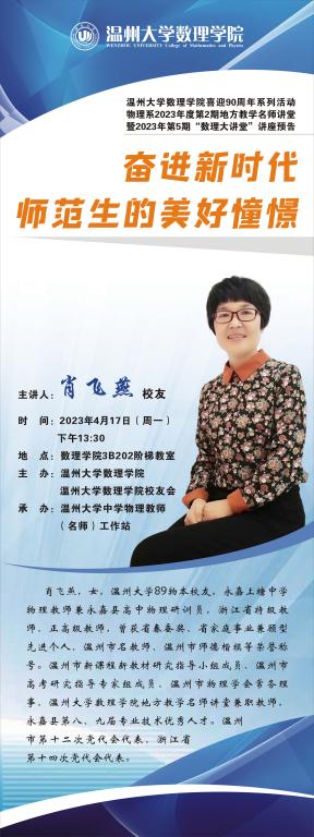 为进一步浓厚校园学术氛围,喜迎永利集团304am官方入口90周年校庆,近日,永利集团304am官方入口借力筹备学校九十周年校庆之机,与校友共商人才培养大计。4月17日下午,学院邀请浙江省特级教师、正高级教师,永利集团304am官方入口89物本校友肖飞燕老师为数理学子开展主题讲座:奋进新时代,师范生的美好憧憬。肖飞燕老师不仅在物理教学上取得了卓越的成就,而且十分关心母校学子发展,精彩讲座受到师生一致好评。