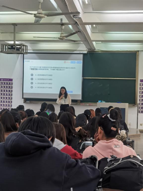 此次公开课为《统计学》第11.3章节中的长期趋势变动分析。黄老师基于温州市气温数据集,利用动画模拟形式,直观形象地向同学们展示了时间序列趋势因素的构成和分解,引出了长期趋势测定的概念,接着详细地讲解了时距扩大法和移动平均法的定义和计算方法,通过案例讲解方式让同学们加深该方法的应用,适当地做了知识点的拓展。课堂上,同学们听课认真,反馈积极,课堂秩序良好。