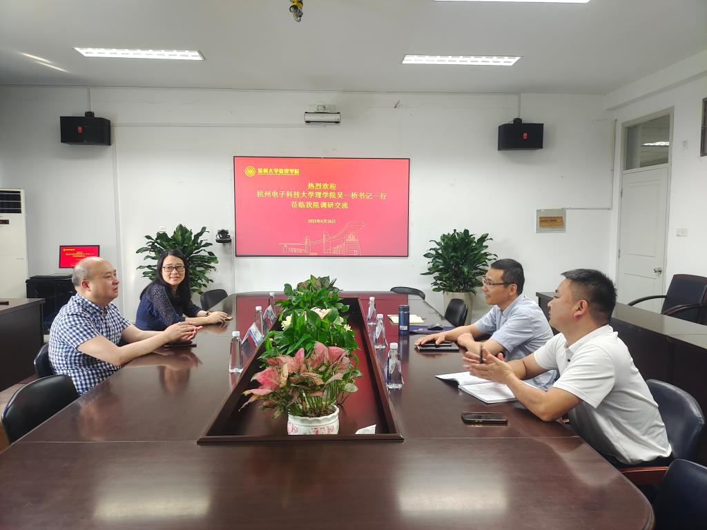 6月26日下午,杭州电子科技大学理学院党委书记吴一桥、副书记孟金环来访永利官网交流调研,永利官网党委书记陈兴桂、副书记章志图、学工办副主任陈亮予以热情接待。座谈交流中,陈兴桂书记介绍了永利集团304am官方入口的办学历史,以及党建领航下的学科建设、人才引进、专业建设、校友工作等相关工作,赢得了来访领导的赞赏。双方还就党建共建、校友基金等话题展开深入交流。座谈会后,杭电理学院领导们参观了苏步青谷超豪纪念馆,并赞叹温州“数学家之乡”的深厚数学文化积淀。