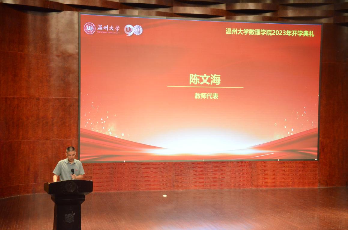 教师代表陈文海教授发言,他和新生们分享了一些关于大学生活的思考和建议,一是要充分认识到学习的重要性,拒绝躺平;二是学习需要坚持和耐心,才能扎实掌握专业知识;三是要将专业学习和实践结合起来,通过不断学习和实践,跟上时代的脚步。希望同学们在值得奋斗的青春时期,奋力拼搏、积极进取,在温大拥有一段难忘而有意义的青春。