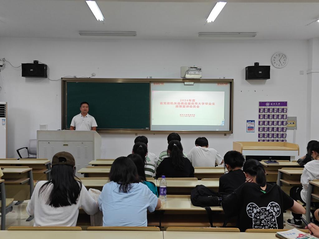 近日,上级部门发布选调生相关公告,开展我省2024年度党政机关选调应届优秀大学毕业生工作。为增进毕业生服务,及时将相关信息传达给毕业生,9月26日下午,永利官网在3B207教室召开选调生政策宣讲动员会,符合本次选调要求的相关专业毕业生代表30余人以及毕业班相关辅导员参加会议。
