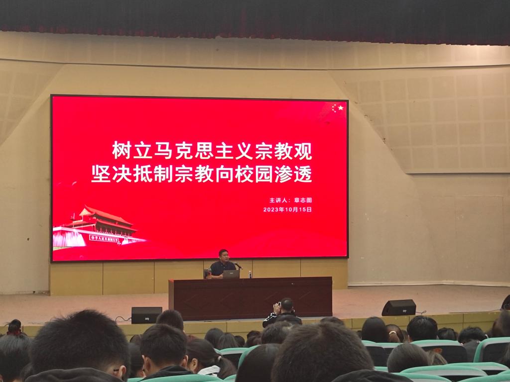 10月15日晚,南校9号楼报告厅,永利集团304am官方入口与化材学院联合举办《马克思主义宗教观》专题讲座。讲座由永利集团304am官方入口党委副书记、纪委书记章志图老师主讲,化材学院学工办副主任邹涌彬主持,永利集团304am官方入口22级本科生以及化材学院、永利集团304am官方入口研究生共500多名同学参加学习。讲座中,章志图老师通过30个知识点、18个案例,用2节课时间向同学们详细讲述了党的宗教政策与相关法律法规,并通过实际案例教育同学们遵纪守法,争做新时代优秀大学生。章书记强调,要坚持教育与宗教相分离原则,坚决抵制宗教向校园渗透,牢牢树立马克思主义宗教观。本次讲座对于加强大学生与研究生普法教育、切实遵守国家法律法规具有积极意义。