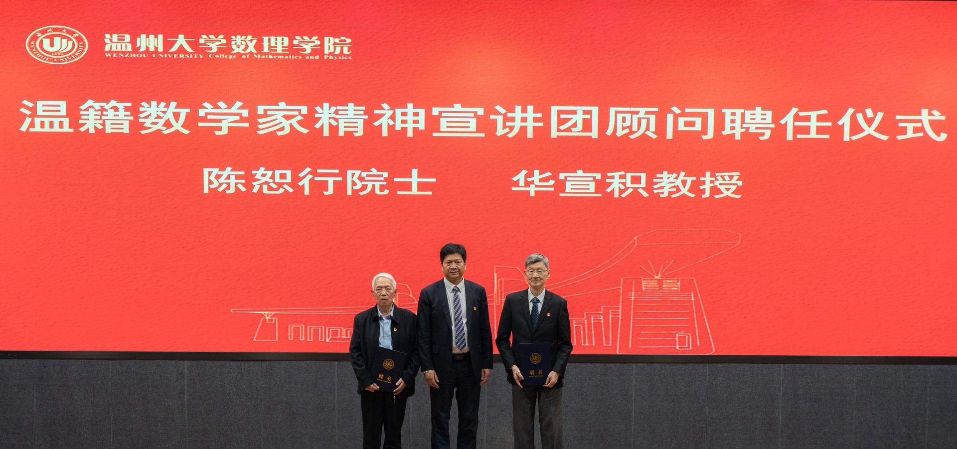 成立仪式上,庄兴忠为数学家陈恕行教授、华宣积教授颁发宣讲团顾问聘书。陈恕行、华宣积两位顾问为宣讲团首批成员颁发证书。