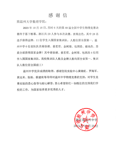 温州中学来信感谢永利官网教师助力物理竞赛斩获佳绩