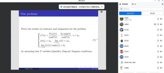 10月20日下午,上海师范大学储继峰教授做客永利官网数理大讲堂,为永利官网师生在线上做了主题为《History and recent progress on Nagumo-type uniqueness of nonlinear differential equations》的学术报告,吸引了众多师生参与。在报告中,储继峰教授用非常通俗的语言为大家详细介绍了关于非线性微分方程Nagumo型唯一性的研究情况。首先,储老师介绍了非线性微分方程Nagumo型唯一性的研究历史,以及一些标志性结果;之后,介绍了最近关于半区间上二阶非线性微分方程Nagumo型唯一性方面的成果;最后,在应用方面,系统介绍了北极地区的海洋环流运动模型及其研究结果。