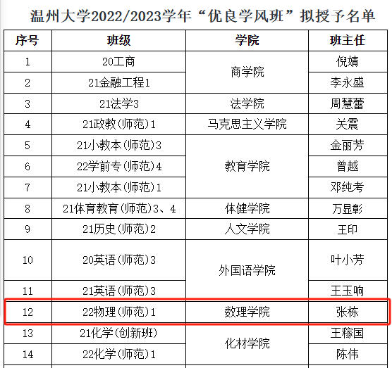 近日,学校公布永利集团304am官方入口2022/2023学年“优良学风班”名单,永利官网22物理(师范)1班(班主任:张栋,班长:张振宁)获评为校级“优良学风班”。特向该班表示祝贺,并希望全院各班以“优良学风班”为榜样,大力推进班集体建设和班级学风建设。