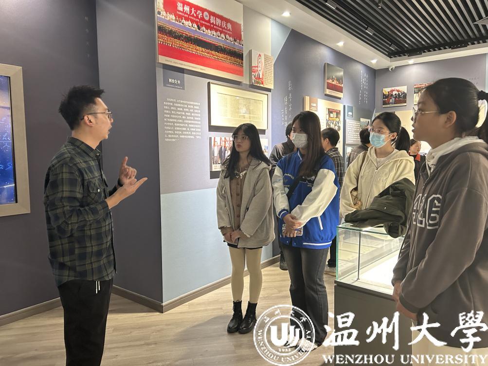 在雁山厅授课结束后,全体讲解员移步至岩松堂二楼的苏步青谷超豪纪念馆。纪念馆讲解员鲁逸晨、张怡、袁鹏英、高博、戴战钊、景芦东等同学分别向曾老师展示了不同展板的讲解片段,而曾老师也倾囊相授,提出了许多宝贵的指导建议。在最后自由提问环节,讲解员们积极提问,曾老师也一一细心回答,耐心解决讲解员在讲解时遇到的问题。