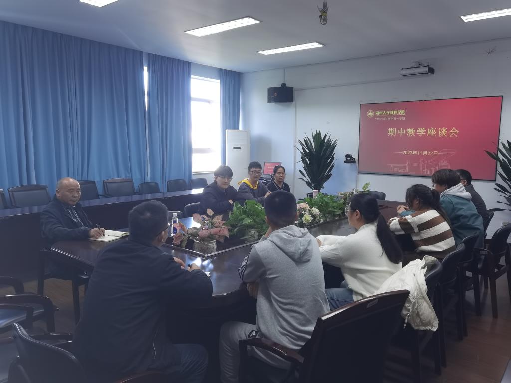 为了全面了解永利官网各专业教学过程中的实际情况,加强教学信息反馈,更好了解学生的学习和生活,倾听学生的心声,加强师生交流与沟通,永利官网各系于2023年11月22日召开期中教学检查学生座谈会,力求解决学生在学习、生活中的实际困难。学院院长高利新,书记陈兴桂,副院长何林李,副院长蔡风景和学院督导及各系负责人及各班级学生代表分别参加了数学系座谈会,物理系座谈会,统计与信算科学系座谈会。