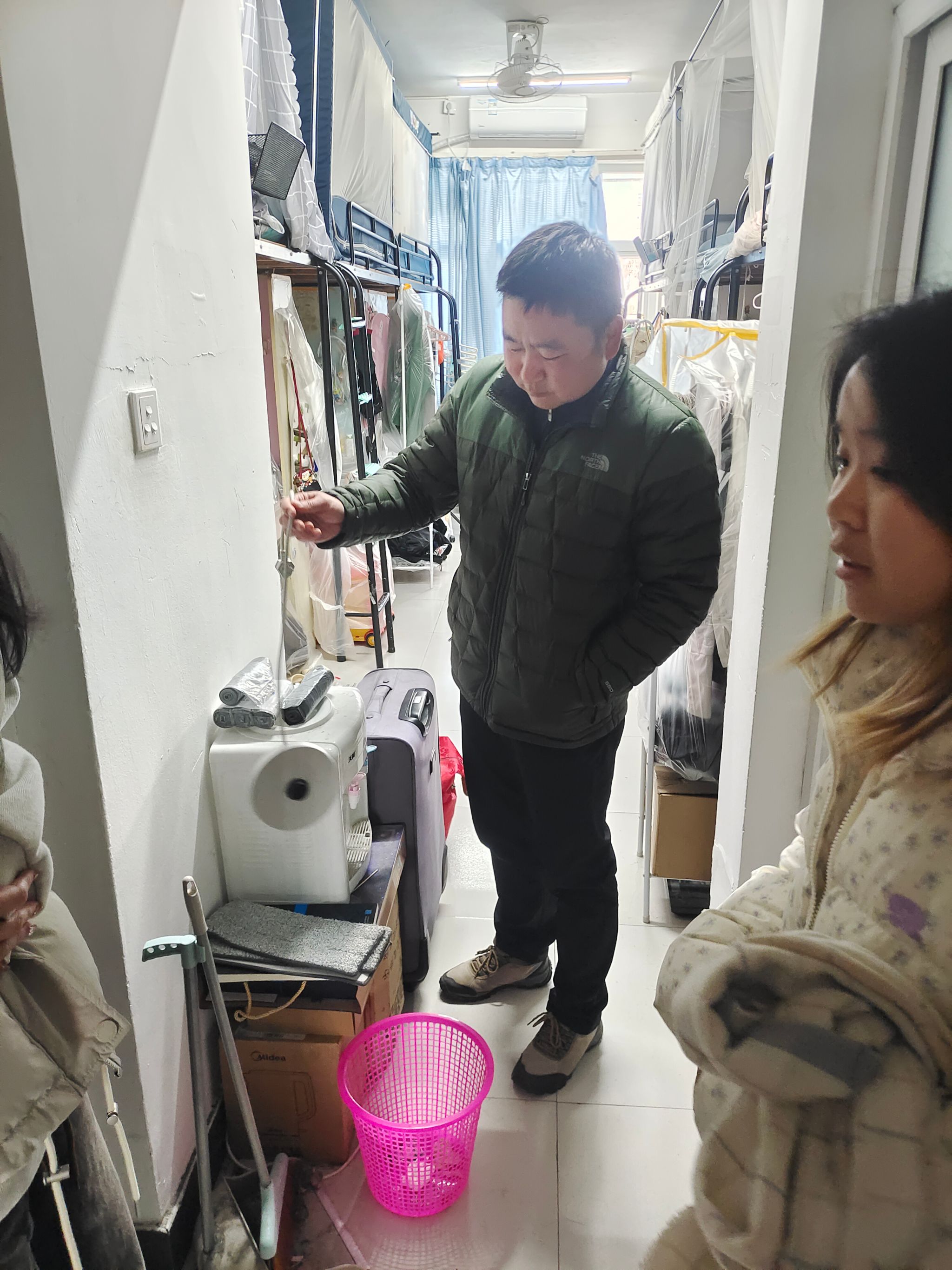 为加强永利集团304am官方入口寒假留宿学生的公寓安全教育管理工作,保障学生人身安全,2024年1月25日,永利集团304am官方入口党委副书记章志图、学工办副主任陈亮老师,走访寒假留宿学生寝室,排查安全隐患,提升学生安全意识。
