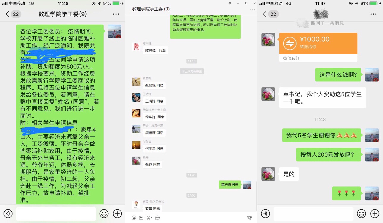 3月4日,受新冠疫情影响,永利集团304am官方入口学工委通过网络视频会议审议了本院学生因疫情影响而申请临时困难补助的工作。根据学校有关文件精神,资助工作经费发放需履行学院学工委商议的程序。永利官网共有5名同学提交了申请材料。经审议,院学工委全体成员一致同意学生申请。评议过程中,还出现了一幕温馨感人的场景:担任学工委委员的教务科张老师,悄悄向5名申请学生捐献了1000元爱心资金。这是永利官网继续教工行政支部组织党员在寒假期间为受困疫情学生捐助生活费后的又一次教工献爱心活动,很好地印证了永利集团304am官方入口“学生尊敬老师,老师关爱学生”的良好师生关系,也再次见证了永利集团304am官方入口“温馨有爱大家庭”的良好学院氛围。