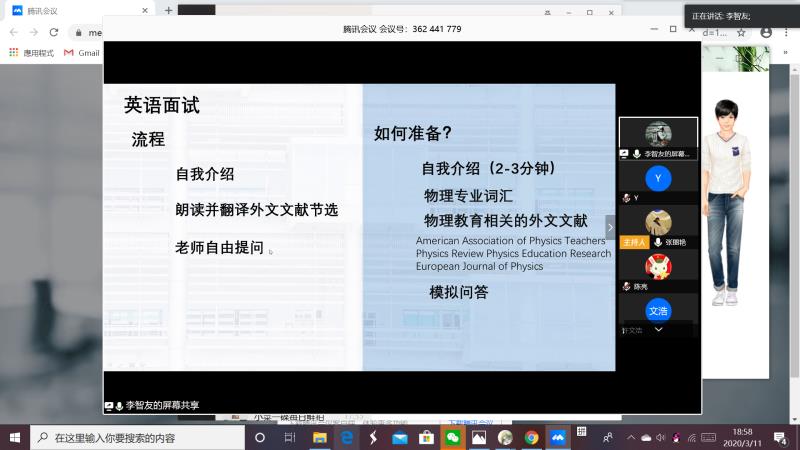 为帮助永利官网学生明确考研目标,鼓励更多学生有针对、有方向、高效率的备战,2020年3月11日,永利集团304am官方入口开展了2020年线上考研复试指导交流会。永利集团304am官方入口副院长何林李老师,物理系系主任王艳伟老师出席本次会议,学工办主任张丽艳老师担任主持。此外,永利官网诚邀15物本的优秀校友邹伟通、李智友分享考研经验,帮助同学们更加高效的备考。