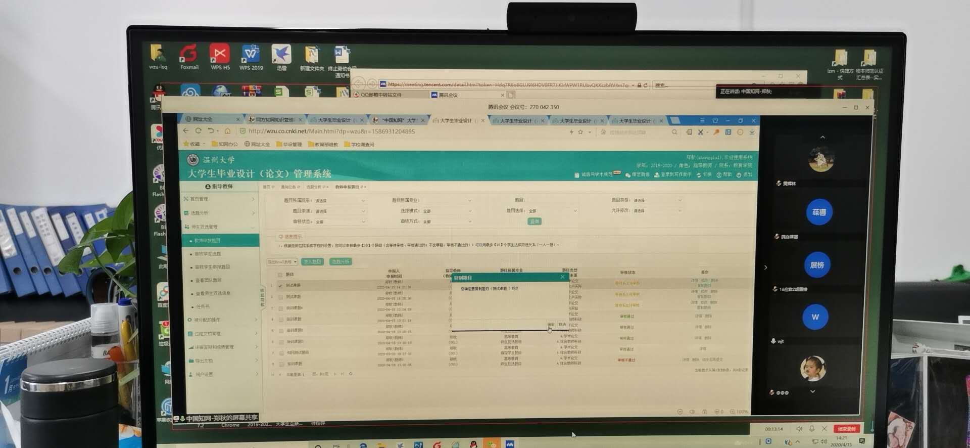 会议布置了毕业设计论文的后期工作,因为疫情缘故,师生不能面对面指导学生,师生缺乏交流,过度依靠网络进行遥控指导,造成论文和毕业设计进程迟缓,为了更好地完成毕业论文后期工作,学院召开了本次视频会议,视频会议上,老师们提出一些知网论文管理系统操作上和流程上的问题,得到了及时的解决。同学们也对后期的进程有了明确的了解。