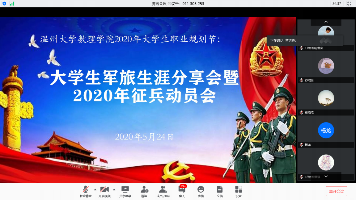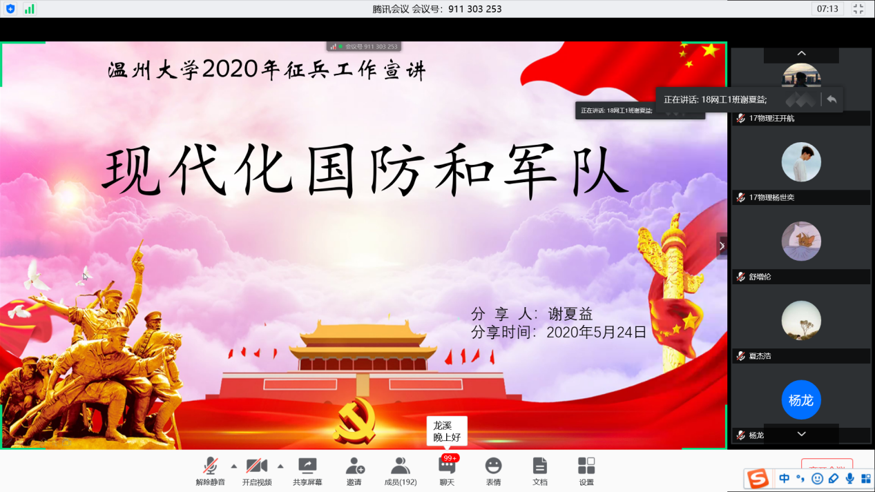 参军报国,无上光荣。大学生征兵工作在“人才强军”战略中占有十分重要的地位,为营造良好的征兵环境,进一步促进征兵工作,永利集团304am官方入口5月24日19:00于线上召开了大学生军旅生涯分享会暨2020年征兵动员会。永利集团304am官方入口党委副书记章志图、学工办辅导员、全体学生党员、学生干部及受国家资助学生参与了此次分享会。本次分享会由章书记主持,并特邀学校红锋俱乐部会长、永利集团304am官方入口征兵工作联系人谢夏益同学为同学们讲解军旅生活、介绍征兵事宜。