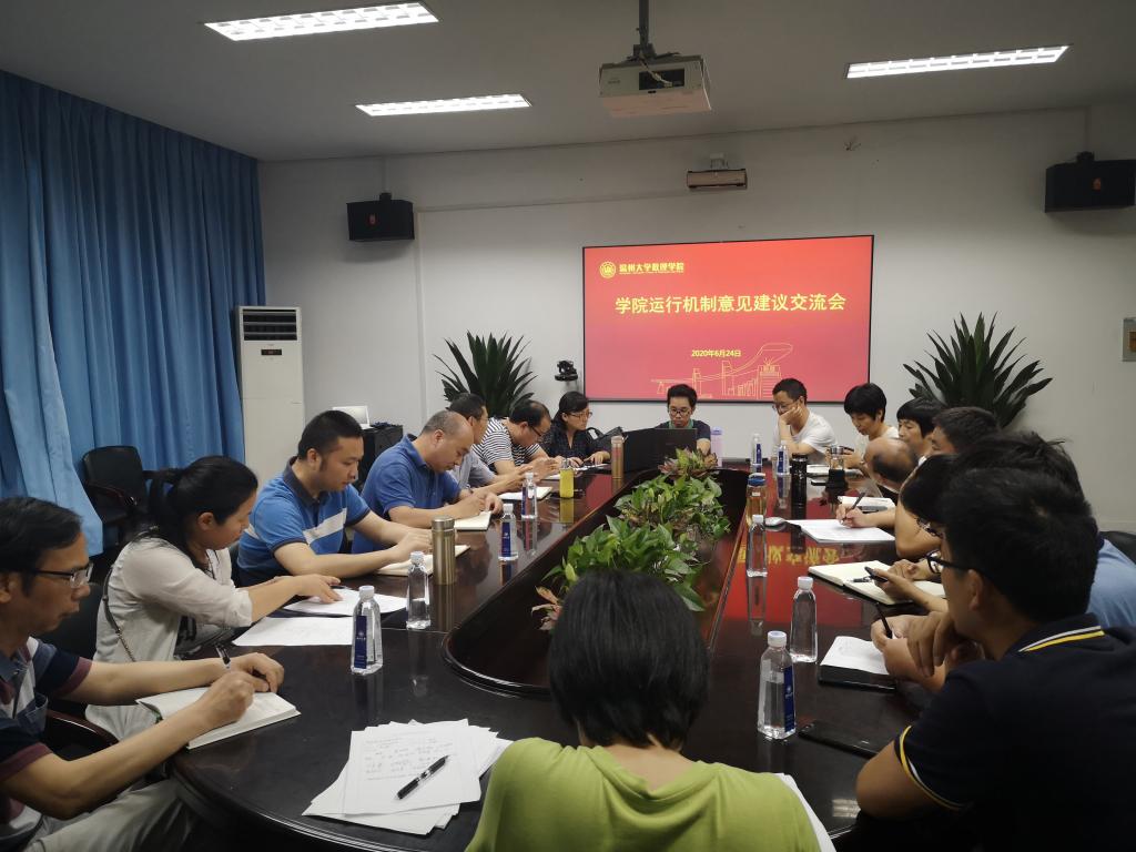 6月24日下午,学院召开运行机制意见建议交流会,总结学院重组成立一年以来的中心工作,深入交流当前存在的问题和不足,探讨今后发展方向。交流会由院长高利新主持,学院领导班子成员、各系、室(中心)负责人及工会负责人参加。