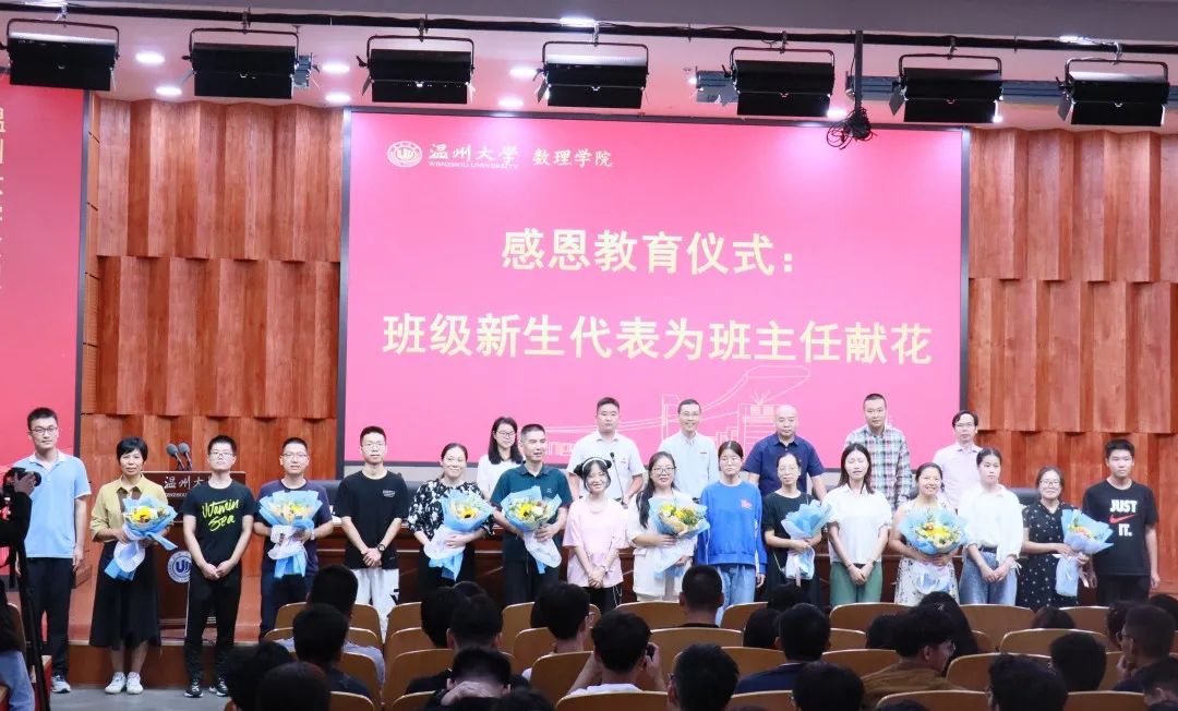 信算专业负责人何明昌教授代表教师发言。他表达了对新生到来的欢迎与喜悦,作为浙江省师德标兵,他也代表全体教师表明了新学期将教师工作做的更加完美的决心。信算专业新生代表上台为何明昌教授献花,以表达学生对何老师长期坚守信算专业、以及恢复信算办学的感恩。典礼上,9个新生班级的学生代表还为班主任献花,以表达对班主任辛勤工作的敬意。