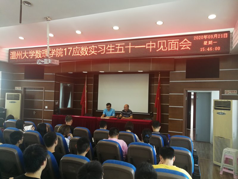 9月21日下午,15名同学来到温州市地五十一中学实习基地,同行的还有3位指导师和学院领导高利新院长。同一时间,另一批11个学生在章志图副书记和朱中坚等老师的带领下,来到龙湾区实验中学实习基地。