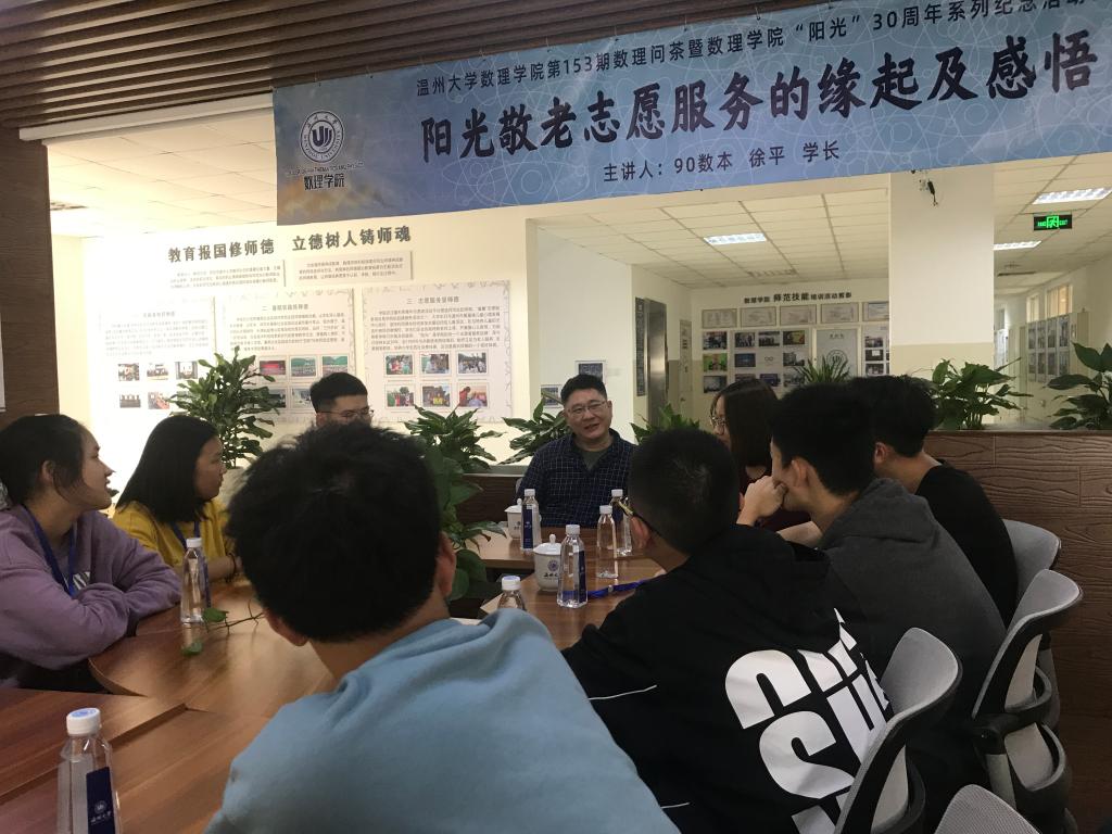 阳光敬老志愿服务是永利集团304am官方入口的传统品牌活动,今年正值学院开展阳光敬老服务30周年,为此,学院隆重举办系列纪念活动。2020年11月2日中午,学院邀请阳光敬老服务的开创者——90数本班毕业生徐平学长,与学弟学妹们分享阳光敬老志愿服务的缘起与感悟。分享会上,徐平学长深情回顾了大学时代,自己作为班长与团支书单怀峰,到洪殿敬老院为老人提供志愿服务的故事,并对学院30年来仍然坚持敬老服务感到振奋、激动和欣慰。他还与学弟学妹们就如何继续做好阳光敬老服务进行了指导,希望大家能多关注社区的孤寡老人群体,为他们送去温暖和关爱。本次活动也是永利集团304am官方入口第153期数理问茶活动,学院党委副书记章志图主持,学工办全体辅导员参加。