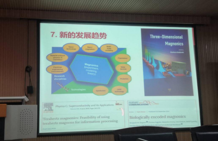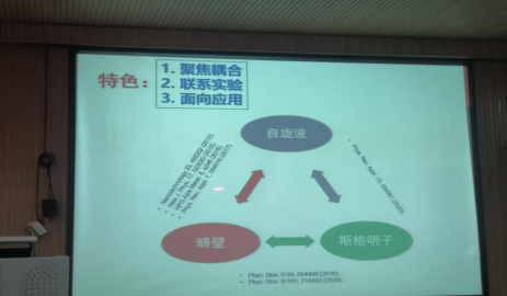 接着邢老师通过介绍了自旋波、磁畴壁、斯格明子的背景,通过自己的思考把它们互相联系起来,并通过持之以恒的研究获得了非常好的实验成果,此外也给在场的研究生很大的启发。