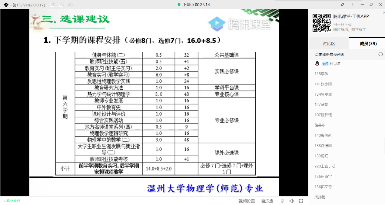 第三个部分是柯老师提供给大家的选课建议。在下个学期,大家将有8门必修课,7门选修课。对此,柯老师给出了他的建议:“在前面的学期中,大部分同学的任选课学分已经有13.5了,剩下的0.5学分建议选修《‘地方教学名师讲堂’系列课程》,如果还不足13.5或者没有满足实践类和教师教育类学分要求的同学,就要根据学分要求所需自行选择课程。”