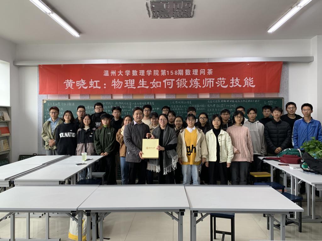 2020年12月1日中午,永利集团304am官方入口在本学院师范技能实训区举行第158期数理问茶活动,物理系黄晓虹老师应邀探讨“物理生如何锻炼师范技能”话题,吸引了20多名同学参加。活动由学院党委副书记章志图老师主持。问茶活动中,黄老师首先分享了自己带队参加全国师范院校师范生技能竞赛的经历,鼓励同学们从低年级开始就要注重板书练习,多翻看初高中教材,积极参加各种层次的师范技能比赛,打好师范技能基础。20物理班主任王振国老师也参与了本次问茶活动。