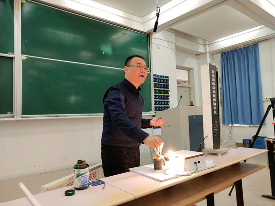 之后,孔兴隆老师对物理实验创新的思路和途径、物理实验创新的方向和原则、物理实验创新的新特点和新发展、物理实验创新的应用案例进行了讲解。其中他突出讲述了新材料、新技术的应用,并通过现场实验向同学们展示。最后孔兴隆老师以对未来教师提出的新要求“一种精神的树立(创客);两种思想的转换(向智能化融合,向标准化教具推广);三种技能的掌握(设计技术,信息技术,加工技术)”总结此次分享。