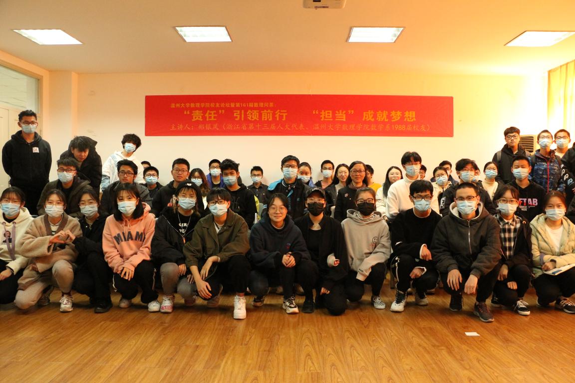 在当前疫情防控形势趋紧的形势下,2021年1月15日下午,永利集团304am官方入口举办第161期数理问茶活动,邀请永利官网1988届校友郑银凤,与大学生谈社会责任。郑银凤校友是龙湾区教师发展中心研训员,正高级教师,曾获全国优秀教师、浙江省特级教师、浙江省优秀教研员、浙江省家庭事业兼顾型先进个人等荣誉,现为温州市第十一届政协委员、浙江省第十三届人大代表。