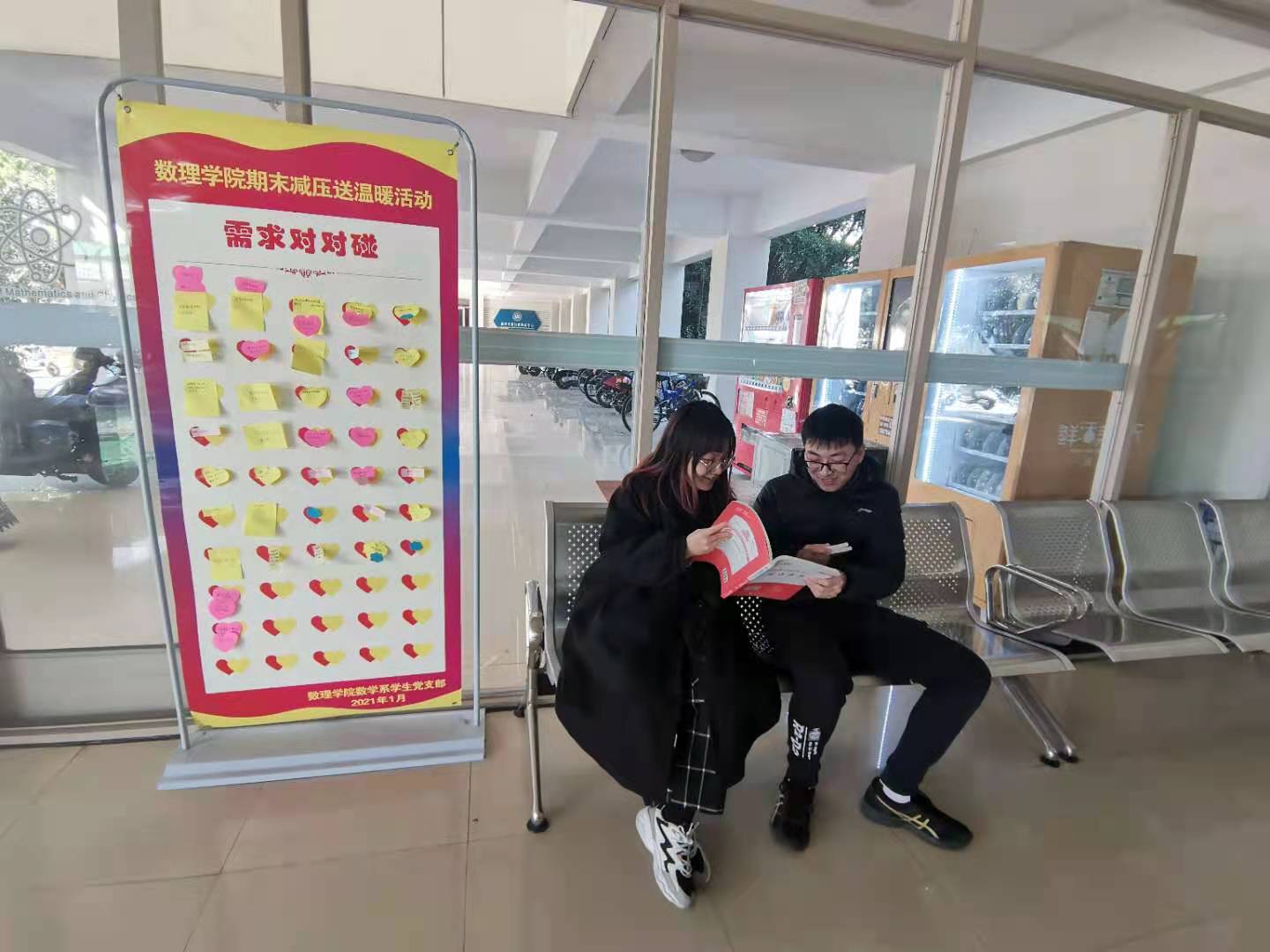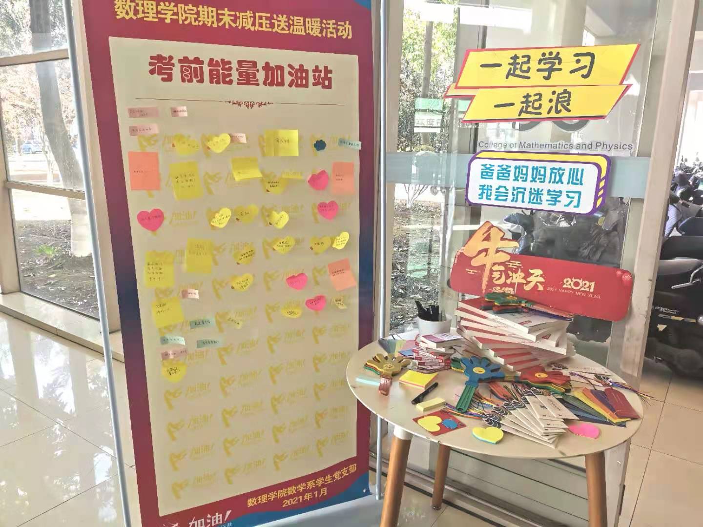 2021年1月15日,“考试能量加油站”和“期末需求对对碰”两个特色活动在永利集团304am官方入口大厅举行,支部党员将收集到的能量祝福语和需求分别张贴到相应区域。“考试能量加油站”充满了同学们对于期末考试的期望;“期末需求对对碰”贴满了同学们的一些需求,数学系学生党支部的学生党员对每个需求都给予了回应。除此之外,学生党支部还准备了教资参考用书以及心理健康小贴士书签等供学院同学使用,以最贴心、最温暖的方式,助力数理学子的期末考试。
