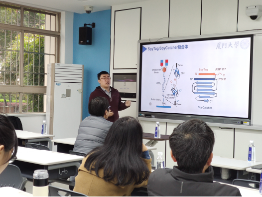 随后,博士后也针对近期的研究成果进行了基于单分子磁镊技术的GB1蛋白和SpyTag/SpyCatcher蛋白复合体的折叠和去折叠研究报告。郭子龙博士后是永利集团304am官方入口的优秀硕士毕业生,也是厦门大学物理学院培养的优秀博士人才,现于国科大温州研究院深造,研究方向主要是基于单分子磁镊技术,研究DNA凝聚,蛋白质折叠去折叠等课题。报告中郭子龙博士后清晰条理地介绍了GB1蛋白质的研究背景并讲解了如何通过单分子磁镊技术研究GB1蛋白在3-160 pN下的折叠和去折叠过程,从而得出了较为完整的自由能曲面信息;并分享了近期的研究成果即通过形成共价连接的SpyTag和SpyCatcher的受力位点的设计,在单分子实验中提供特征信号的连接方式,得到了师兄师妹们的崇拜和掌声。