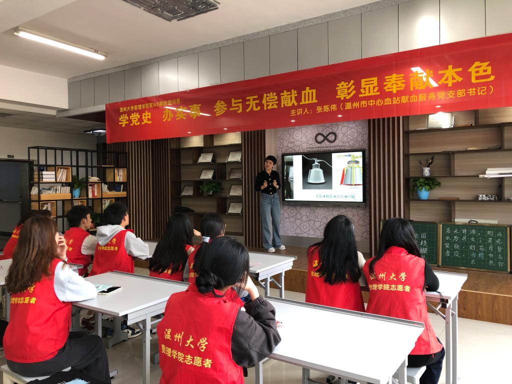 在党史学习教育的蓬勃热潮中,为积极推动校地党建联建联学,争取党史学习、业务工作双丰收,4月9日下午,应永利集团304am官方入口邀请,温州市中心血站献血服务党支部书记张陈伟主持第163期的数理问茶活动,我数理学子开设了一场《学党史 办实事 参与无偿献血 彰显奉献本色》主题报告。