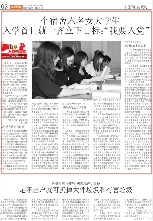 温州晚报:一个宿舍六名女大学生入学首日就一齐立下目标:“我要入党”